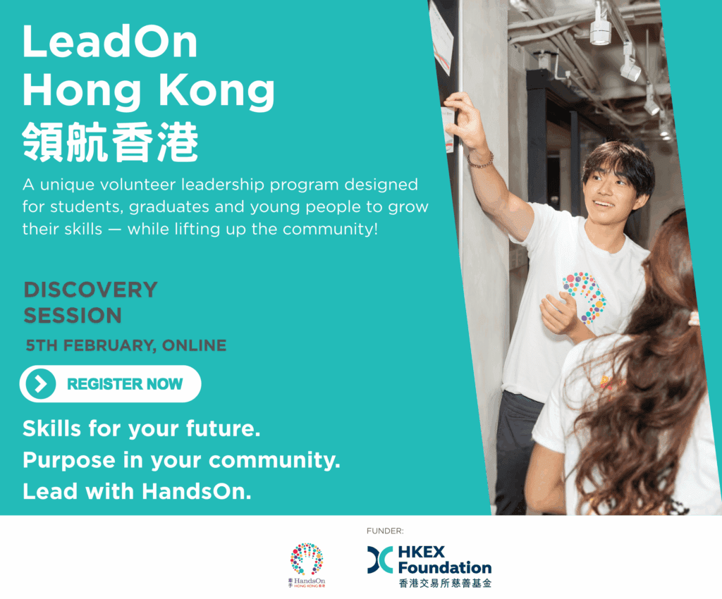 We are pleased to share an opportunity to join LeadOn Hong Kong, a volunteer leadership program for young people led by HandsOn Hong Kong. This program provides structured training in adaptive leadership and hands-on experience managing community programs. It empowers young people to build resilience, empathy, and professional skills, ensuring Hong Kong’s non-profit sector—and our entire community—flourishes for generations to come.